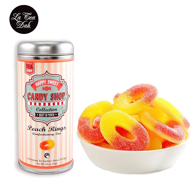 - PEACH RINGS: Transport your taste buds to the candy shop of your childhood with Peach Rings peach tea bags from La Tea Dah. Our delicious fruity tea is made with lightly caffeinated gunpowder green tea and all natural peach and apricot flavor to deliver the classic taste of your favorite gummy candy with none of the sugar or calories.