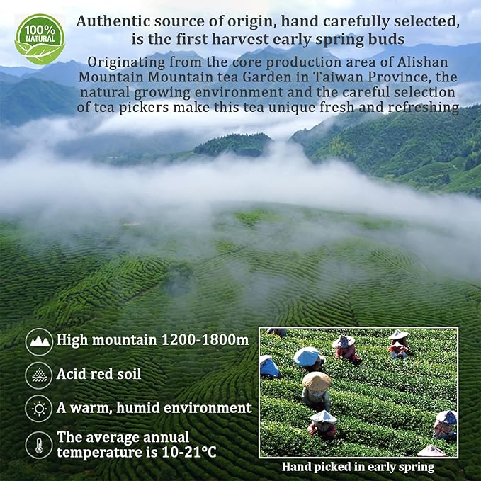 - Taiwan tea alishan thanks to the planting environment of high altitude, the buds are more tender, the shape of the tea leaves is more complete and more resistant to brewing. After brewing, the tea soup is bright golden yellow, with unique floral fragrance, fruity and faint milk fragrance. After the entrance, the tea soup is soft, and it feels soothing and moisturizing. The taste is mellow, and the aftertaste is sweet and long -lasting. Our Alishan tea is loved by the majority of tea enthusiasts
