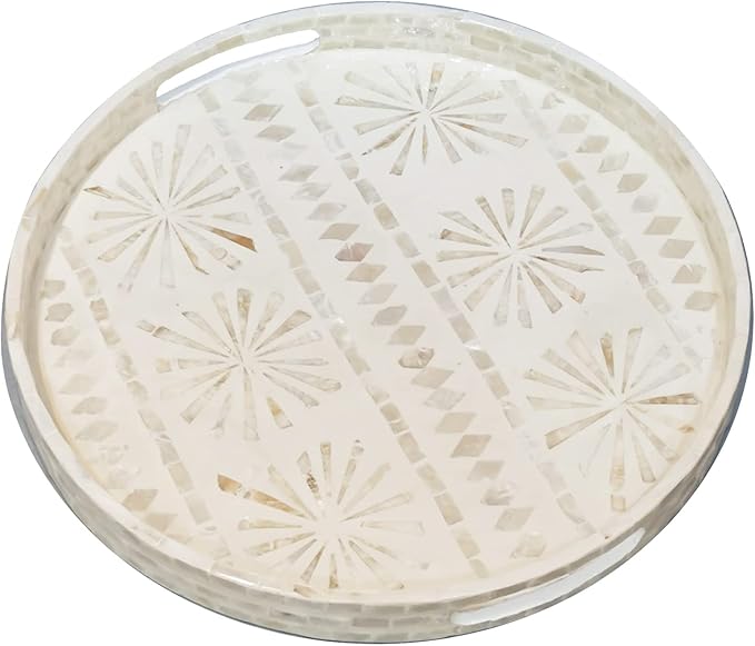 i-lan 18-Inch Round Mother of Pearl Inlay Serving Tray – White Decorative Coffee Table Tray with Handles for Food, Catering, Display & Home Décor (XXL)