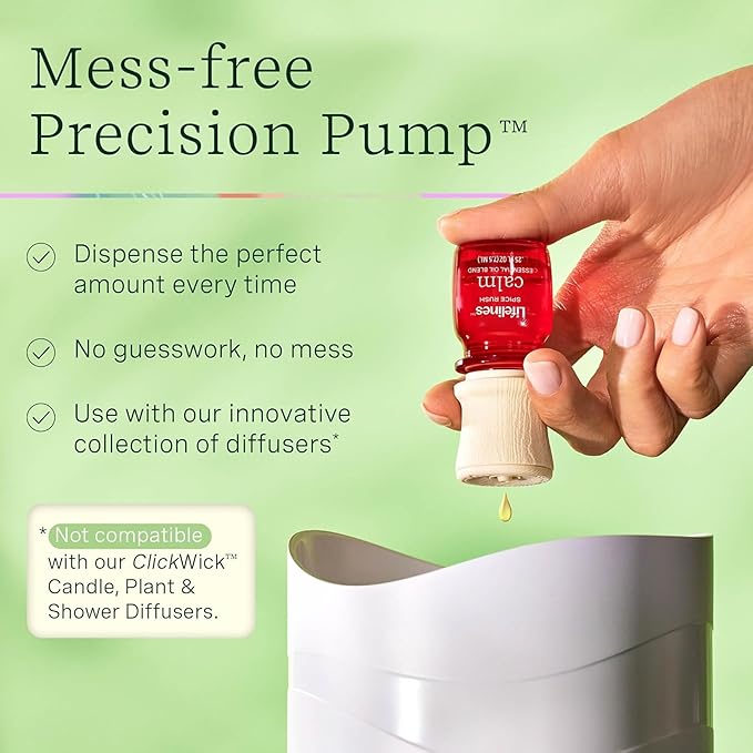 - Mess-Free Precision Pump: Dispense the perfect amount every time with no guesswork and no mess. NOT compatible with our ClickWick Candle, Plant, or Shower diffusers, which require ClickWick Essential Oil Blends.