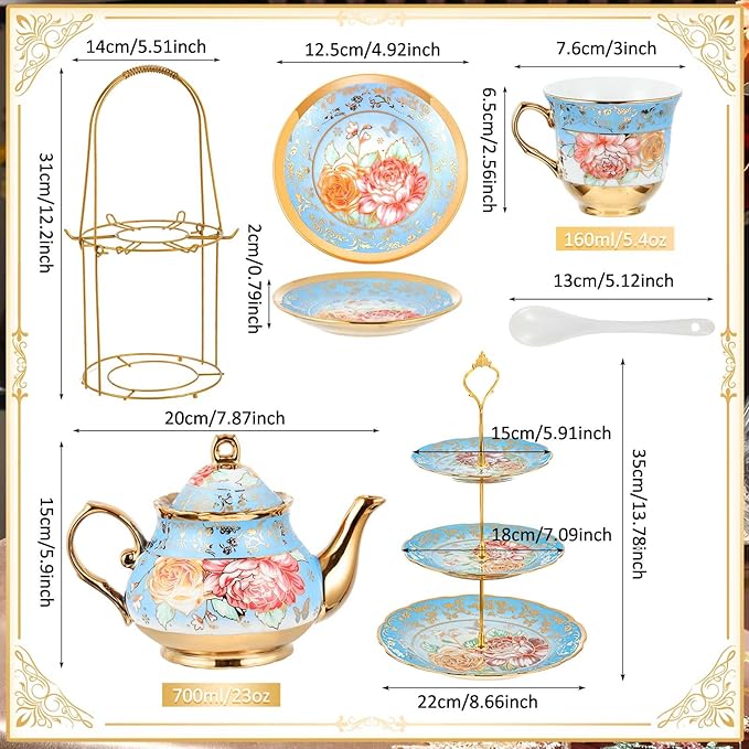 - Various Beverages and Cake Applied: the tea sets for adults are practical, the teapot is about 23 oz/ 700 ml, the cup is about 5.4 oz/ 160 ml, ideal for holding juice, coffee, tea, milk, water and other beverages; The 3 tier cupcake stand is suitable for displaying your cute cookies, cupcakes, desserts, doughnuts, and so on