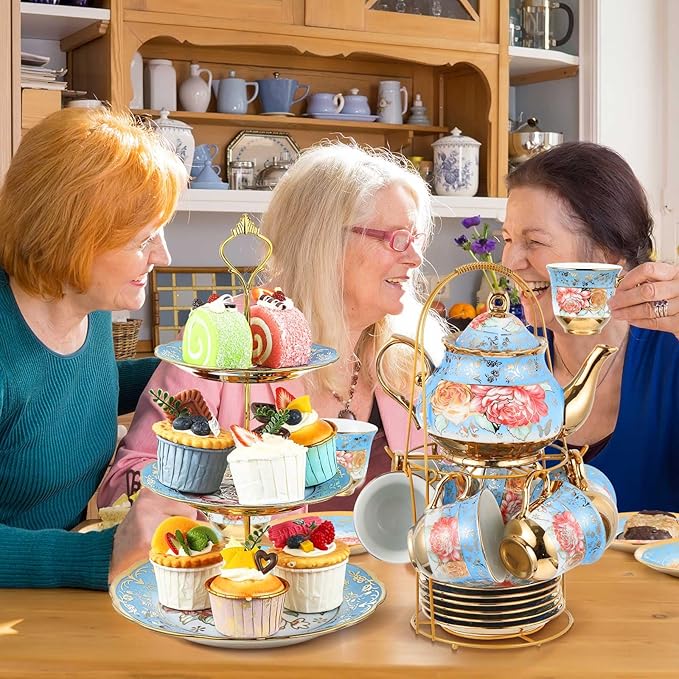 - Safe Ceramic Material: the tea cup sets and 3 tier serving stand are made of quality ceramic, solid and reliable, safe and friendly, featured with European styles, shiny and attractive, the holder is metal, ideal for holding your tea set, to make your space elegant and charming