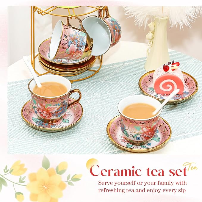 - Complete Set for a Full Tea Experience: package includes a teapot, 6 teacups, 6 plates, 6 teaspoons and a storage rack; This will meet your daily needs and replacements, giving you a different experience
