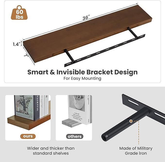 - 【Extra Deeper & Thicker】- Measuring 36"W x 7"D x 1.4"H, these shelves are deeper and thicker than regular floating shelves, allowing you to display more items such as photos, pictures, DVD players, videos, books, toys, and knickknacks on this incredibly stylish display wooden shelf.