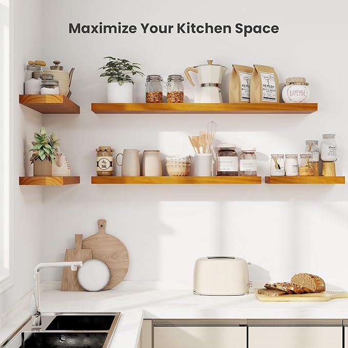 - 【Premium Solid Pine Wood Shelves】- Our handcrafted floating shelves, made from real wood with unique honey oak nodes and grains that bring a one-of-a-kind look and feel to your living space. The lightweight wood material we've carefully selected won't put excessive weight or strain on your walls, offering better wall-mounted stability.