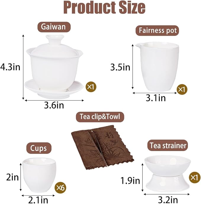 - Versatile Use:Includes 6 cups,1 fair/Infuser pot,1 gaiwan,1 tea towel,1 tea strainer,1 stainless steel tea clips .Everything you need for a perfect tea session, whether at home or on the go.