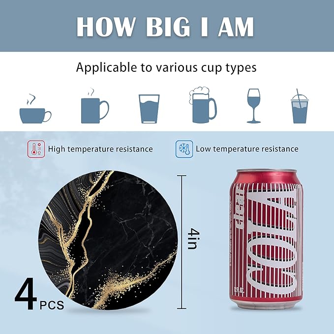 - Suitable Size:Coasters with a big 4 inches diameter size match almost all types of cups and mugs,making them fit with coffee cups, sports bottles and wine