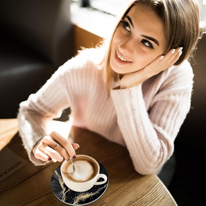 Coasters Set of 4, Black Marble Golden Glitter Ceramic Coasters with Cork Bottom for Kinds of Mugs and Cups, Home Decor, 4''