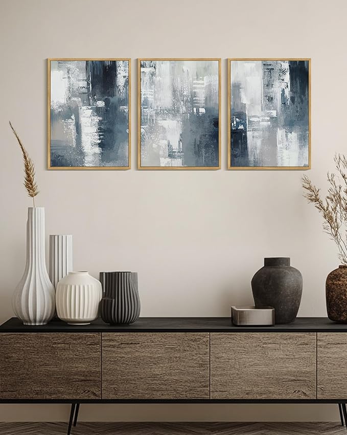 KUVIOKE Navy Blue and Gray Abstract Framed Canvas Wall Art Brush Strokes Block Shape Pastel Wall Decor Modern Minimalist Art Painting for Bedroom Dining Room 12x16in (Natural Framed)