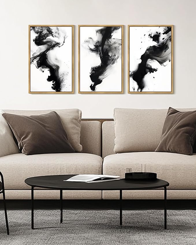 KUVIOKE Black White Abstract Framed Canvas Wall Art Ink Wash Pastel Wall Decor Modern Rendering Illustration Art Painting for Bedroom Dining Room 16x24in (Natural Framed)