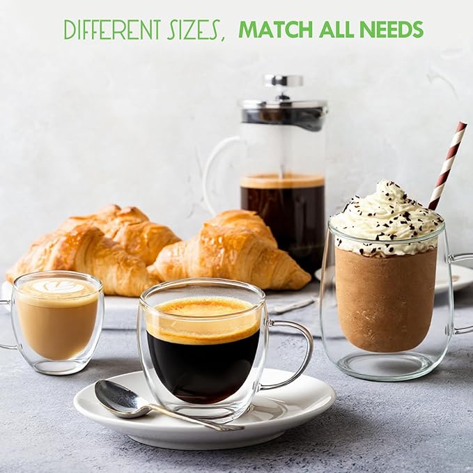 - MULTIPURPOSE USE- The glass coffee mugs are a great choice to be used as espresso cups, latte mugs, cappuccino cups, milk cups, tea cups, demitasse cups and glass mugs for juice or smoothies, and desserts. It’s ideal coffee bar accessories for both home, office, school and Cafe.