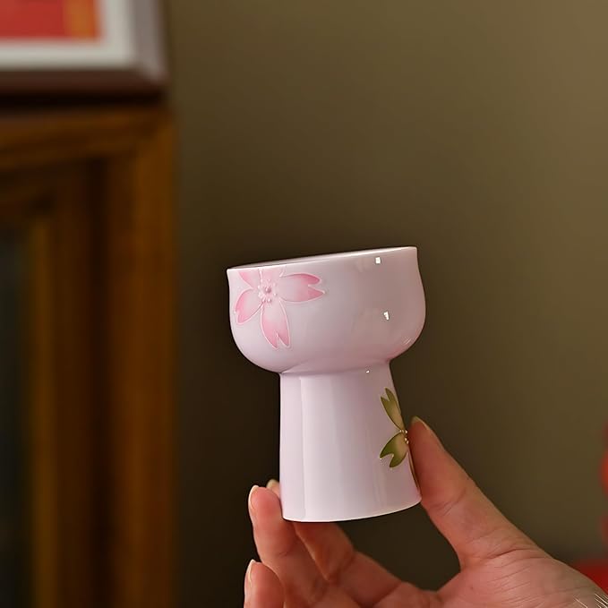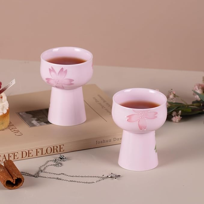 KAMMAK Tea Cups, Porelain Tea Cup Set of 2, 1.8oz Small Ceramic Teacups for Home, Tea Party, Chinese Kungfu Tet Set for Hot/Cold Drink (Pink Cherry Blossoms)