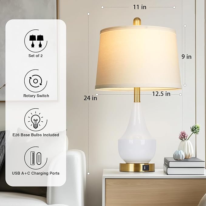 Modern White Table Lamp Set of 2, 24" Ceramic Table Lamp with USB A+C Ports,Classic Beside Lamps Nightstand Lamp Modern Lamp for Living Room, Bedroom & Office -LED Bulbs Included