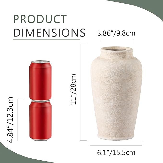 - For Multiple Home Décor Styles --- These decorative vases has excellent decorative effects due to its unique shapes and colors, which is the perfect home décor even without flowers. Whether your style is bohemian, modern farmhouse, rustic, or homey, they all fit in perfectly show off your lifestyle and decorative sense of style.(Length x Diameter=11"x6.1"x6.1").